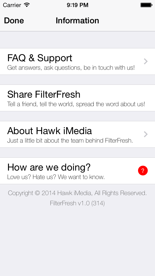 I wanted to take advantage of another third-party service I’ve used in another app to provide first class in-app customer support. The app uses the Helpshift SDK to provide an elegant interface for users to find answers to common questions as well as interact directly with us. Helpshift can take advantage of Apple Push Notifications to let user’s who ask a question know that an answer is available, and FilterFresh takes advantage of this capability. To keep the annoyance factor low, FilterFresh only acquires a Push Notification token (with the accompanying iOS popup) only if the user uses the Helpshift interface. That is to say, we only ask the user for permission to send them Push Notifications if they are using an app feature that requires it.