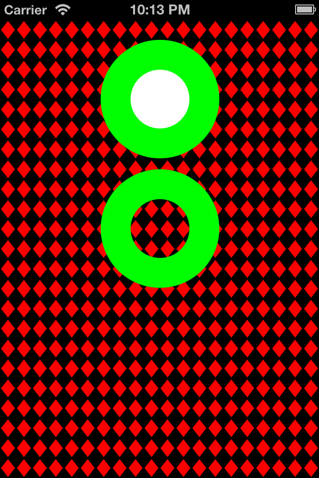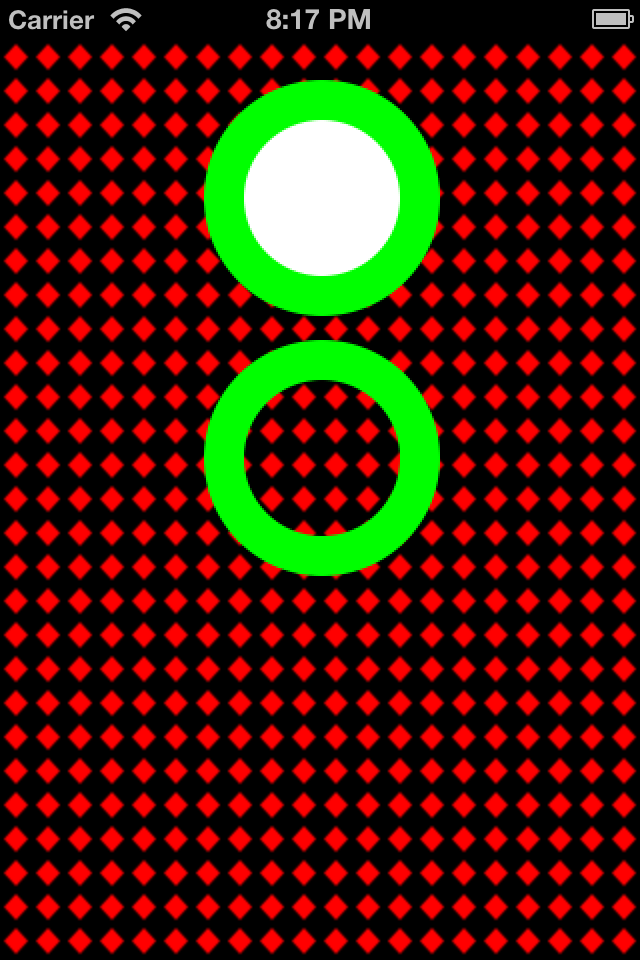 In the first add-on to the sample project, I’ve added a UIImageView with a “filled doughnut”. That is, a green ring, with a white center. The method -filledDoughnutForSize: takes care of producing the image. Quite frankly, it is not much different from the method -patternImageWithSize:forRectSize: from the original example. In the screen shot below, you can see that the green circle with the white inner circle appears as advertised.